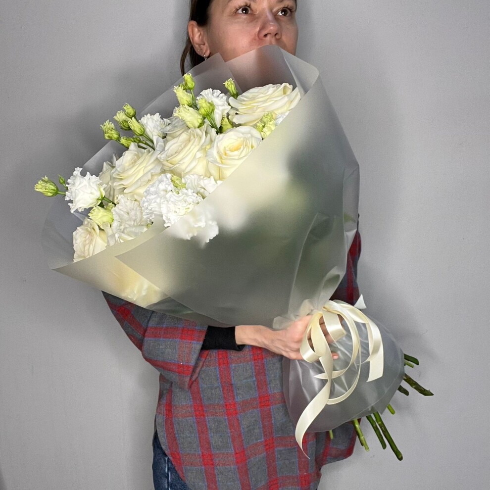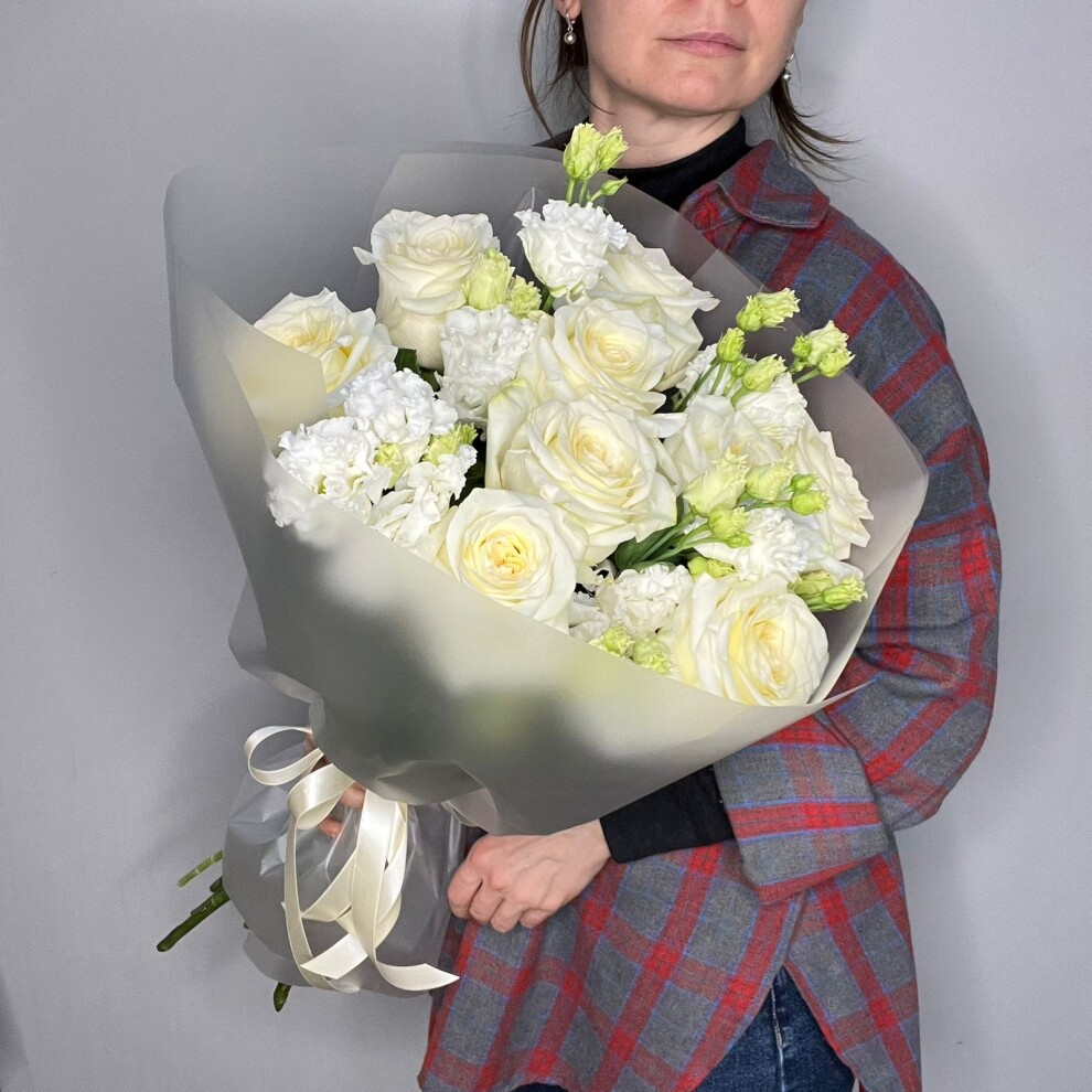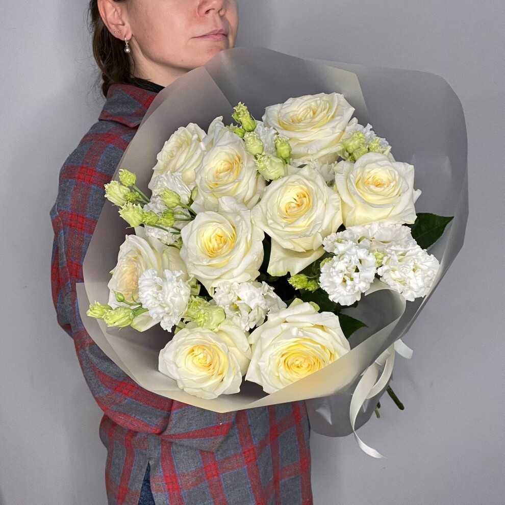 - Роскошь без вычурности: крупные бутоны розы и изящные соцветия эустомы дополняют друг друга, не перегружая композицию.