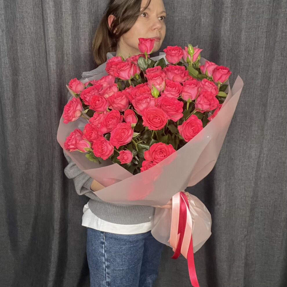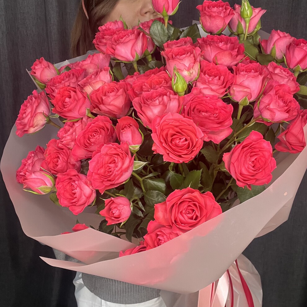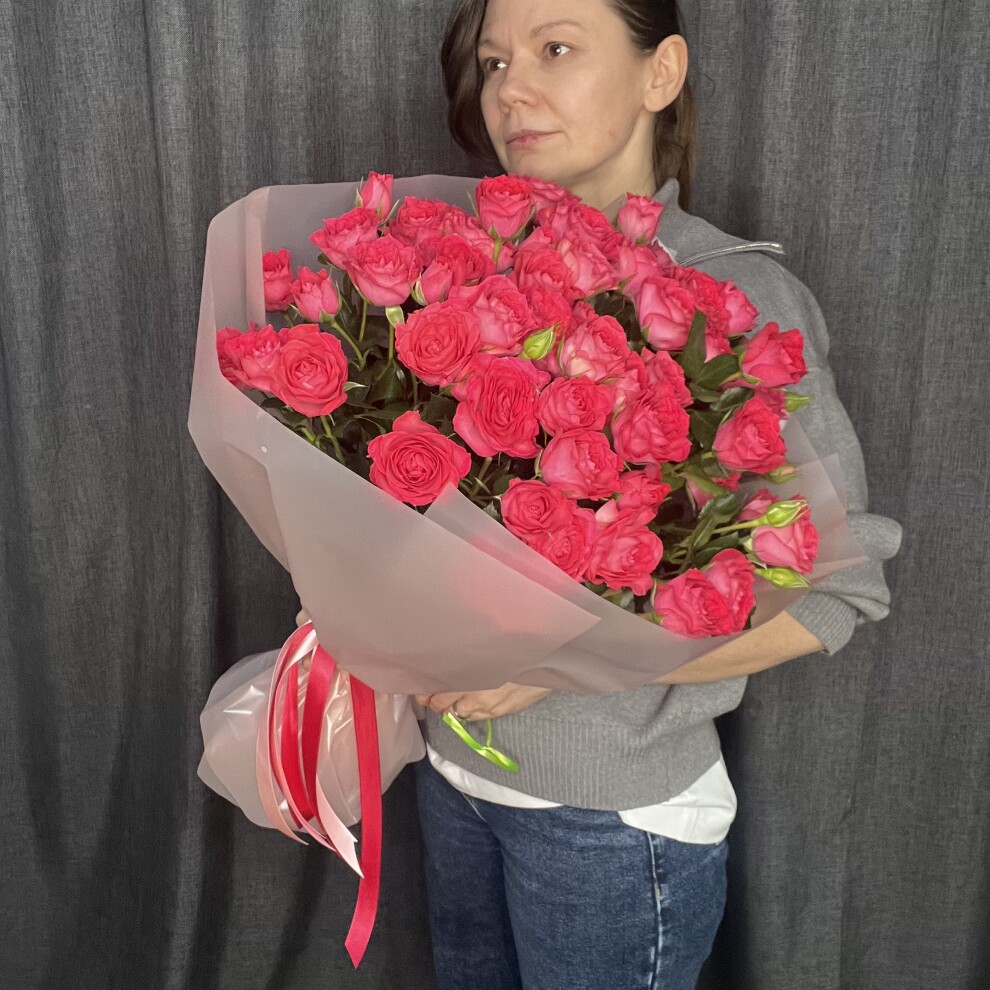 Яркий, сочный, страстный букет из кустовой розы сорта Bella Linda Cerise. Cerise переводится с французского как «вишня». И этот сорт полностью оправдывает имя — глубокий, насыщенный оттенок спелой ягоды, который невозможно забыть.