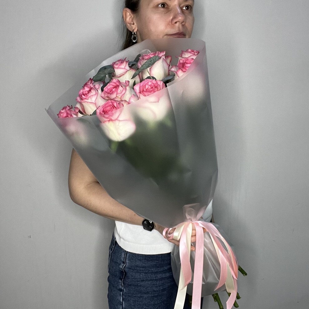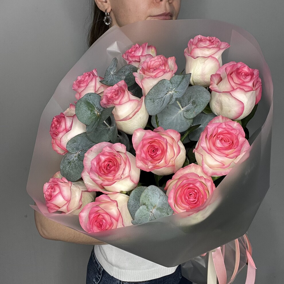Букет из сочетания нежной розы и эвкалипта. Роза сорта Джумилия — редкая акварельная роза, её бутон имеет уникальный градиент: молочно-белое основание, переходящее в ягодно-розовый к краям, с тонкой малиновой каймой.