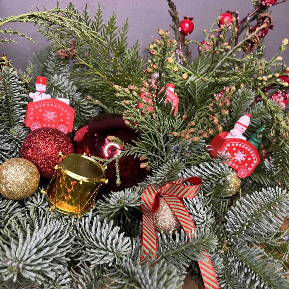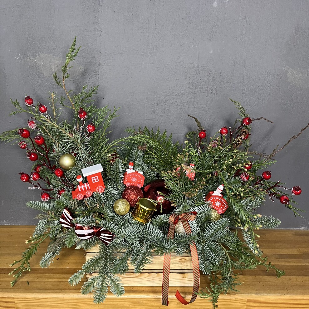 Праздничная новогодняя композиция из изысканной хвои — нобилиса, кедра, туи, кипариса и мережки — создает богатую текстуру и глубокий хвойный аромат. Украшена в роскошной красно-золотой гамме, что подчеркивает атмосферу тепла, роскоши и волшебства. Готовое решение для стильного праздничного декора.