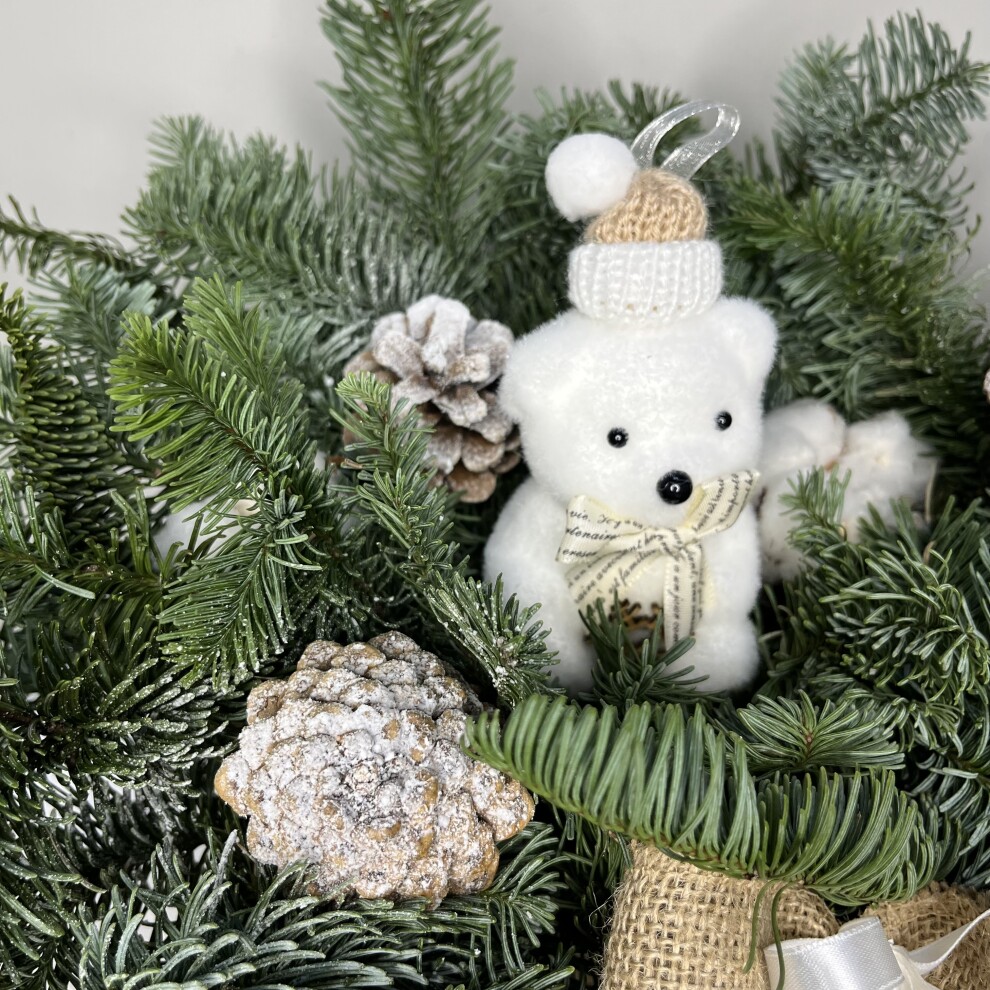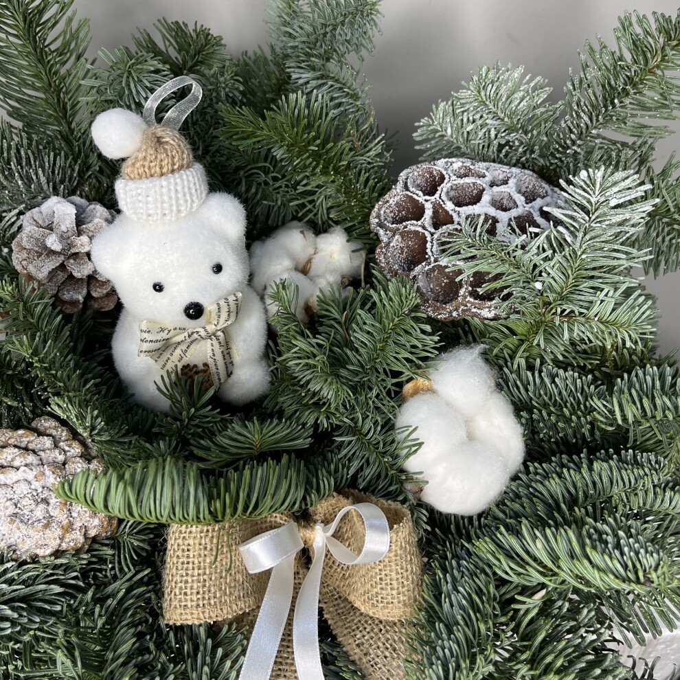 Уютная новогодняя композиция из благородного нобилиса в сочетании с белым мишкой и натуральным декором — сосновыми шишками, пушистым хлопком и заснеженной коробочкой лотоса. Нежная, теплая и по-домашнему добрая — она создает атмосферу сказки и гармонии в преддверии праздника. Идеальный подарок или украшение для дома в зимние дни.
